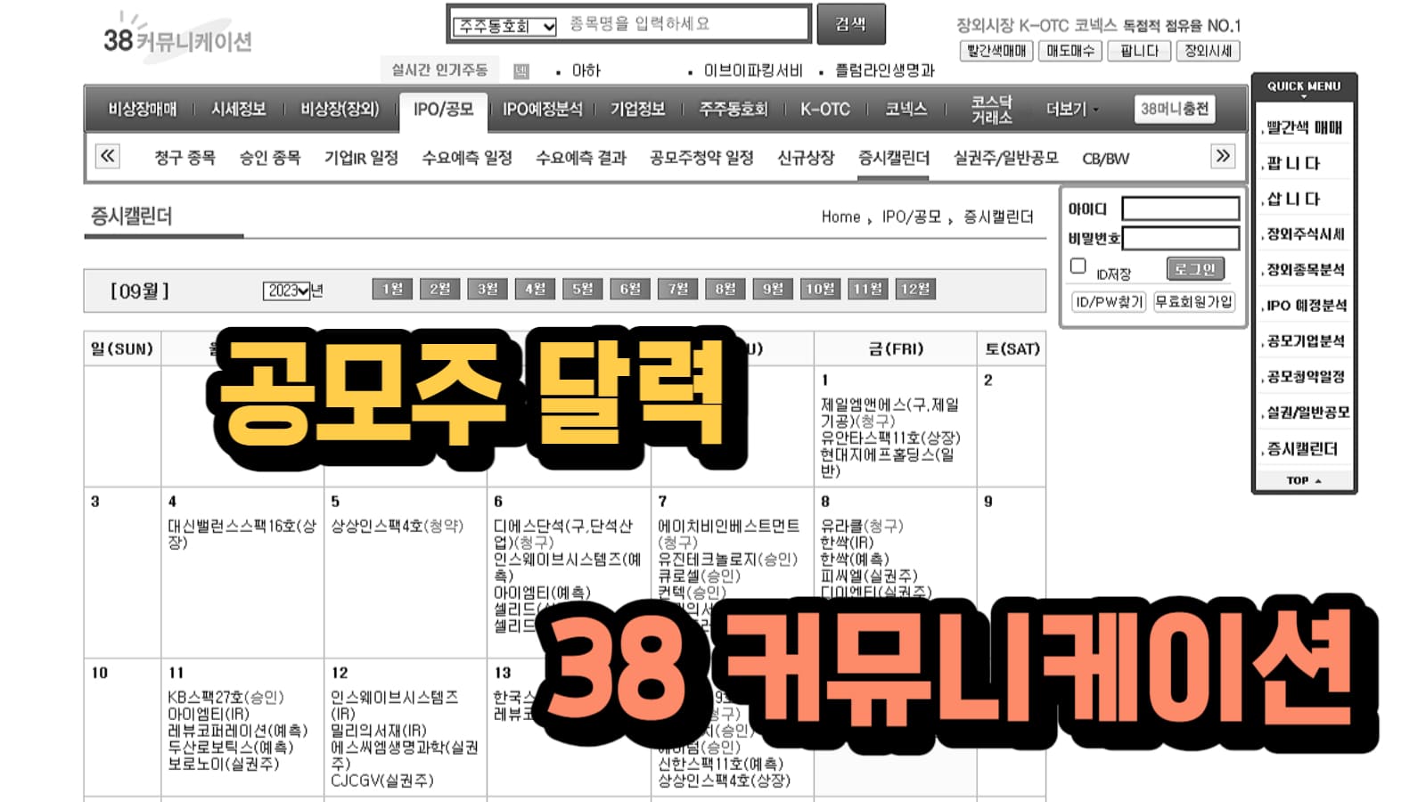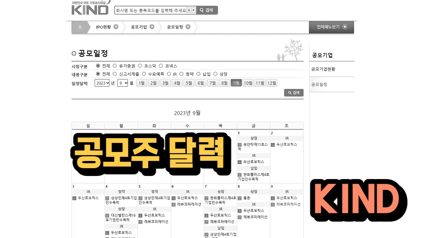다트(DART)와 비슷한 형태의 사이트로 기업공개(IPO) 위주로 돼있습니다. 그리고 보시기 편하게 아래와 같이 달력 형태로 IR, 수요예측, 상장과 같은 과정을 기록해서 보여주기 때문입니다.